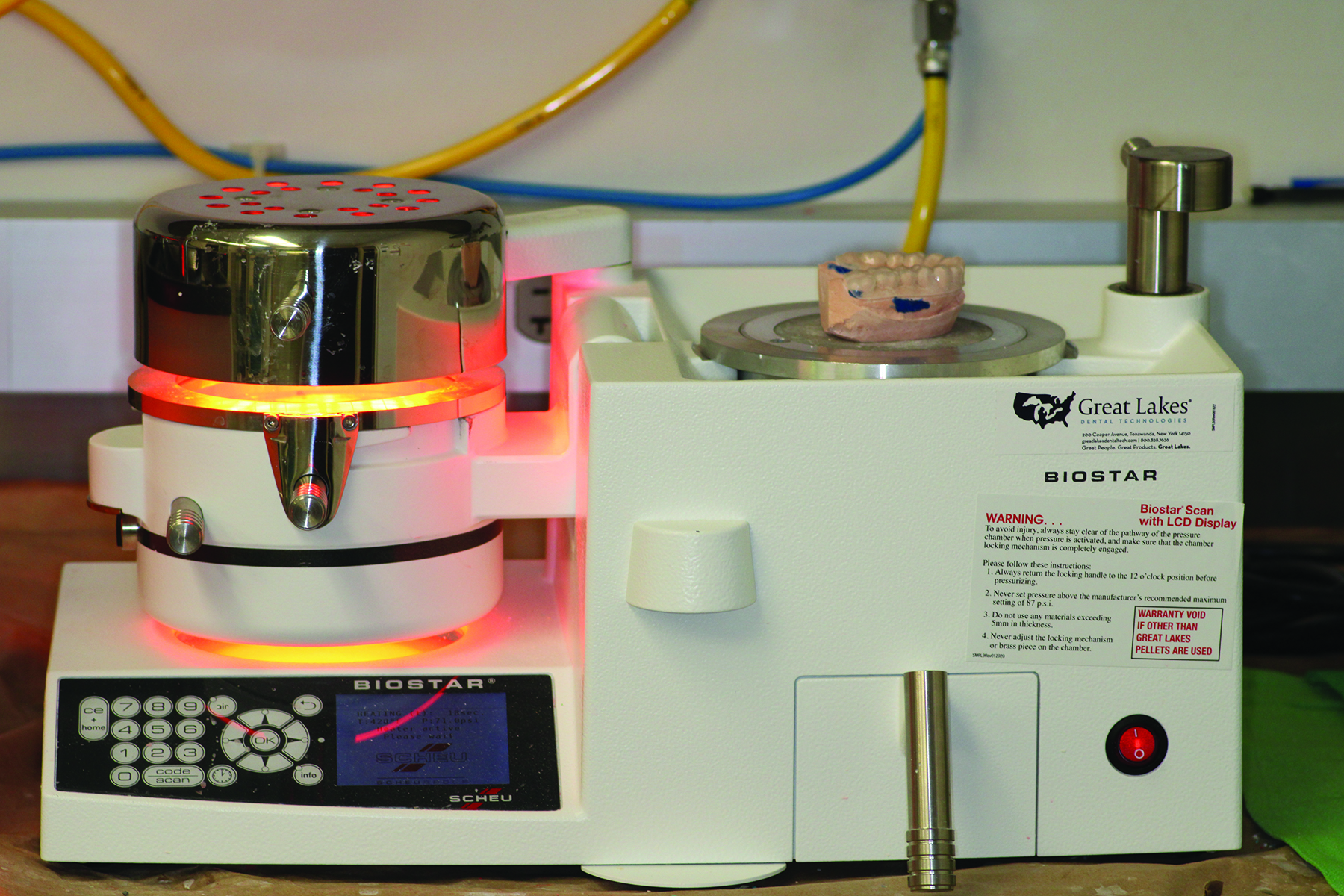 The processing steps for custom-made sports mouth guards include fabrication of a vacuum-formed, soft inner layer over which a harder, pressure laminated layer is added. The inner vacuum-formed layer is fabricated by placing a single sheet of soft, resilient thermoplastic polymer in a specialized thermal vacuum forming machine that heats it, provides a vacuum at the cast base, and then quickly lowers the drooping, warmed sheet over the cast model while allowing the vacuum to run for maximal adaptation (Figure 5). Once cooled, the excess material is removed (Figure 6). The same equipment is used to heat-soften a harder thermoplastic sheet that is pressure fitted over the top of the completed soft inner layer on the patient stone model. Pre-warming the outer surface of the inner layer prior to placement of the harder outer shell helps to facilitate bonding of the two materials.