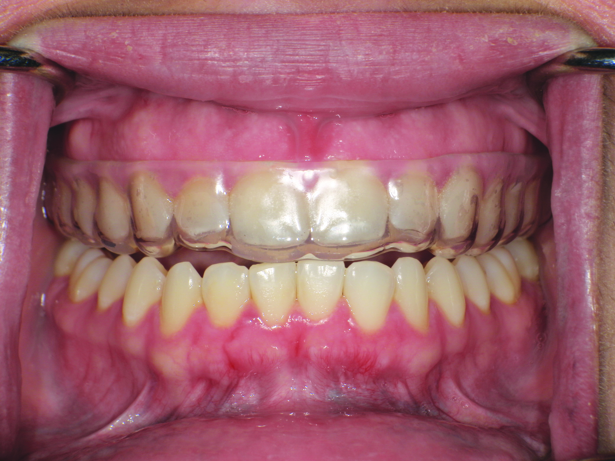 It should be noted that variation in the elastic modulus of the overlying laminate can significantly affect the device’s ability to prevent hard- and soft-tissue damage. Control over the thickness of in-office fabricated sports mouth guards can be obtained using combinations of inner and outer laminated layers.1 The finished product should have bilateral interocclusal contacts (Figure 7), cover all labial and lingual maxillary tooth surfaces, and have an open palate (Figure 8).