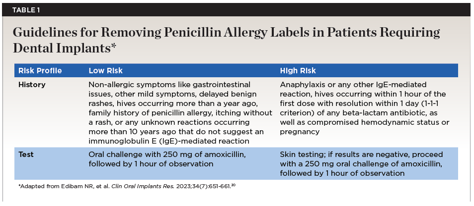 To manage penicillin-allergic patients, especially those requiring dental implants, a protocol for penicillin allergy delabeling has been proposed.20 This process involves removing the penicillin allergy label, or designation, from the patient’s medical records after appropriate testing. Delabeling is particularly important, as studies show that penicillin allergies are often misreported. While approximately 10% of the US population claims to have a penicillin allergy, based on skin testing, less than 1% of individuals are actually allergic.9 Additionally, allergic reactivity may decline over time, and if a reaction to penicillin occurred more than 10 years ago, the likelihood of a true allergy is significantly reduced.27 Identifying patients with a genuine penicillin allergy can help prevent unnecessary use of alternative antibiotics that may be less effective or carry greater risks for dental implant procedures.