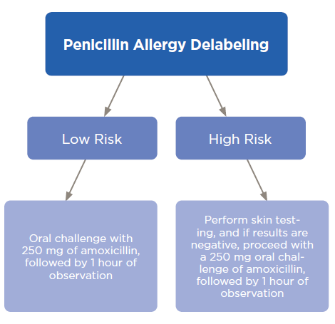 Overall, most patients fall into the low-risk category and can be safely delabeled with a simple oral challenge. Table 1 and Figure 1 review the process of delabeling for high- and low-risk individuals.