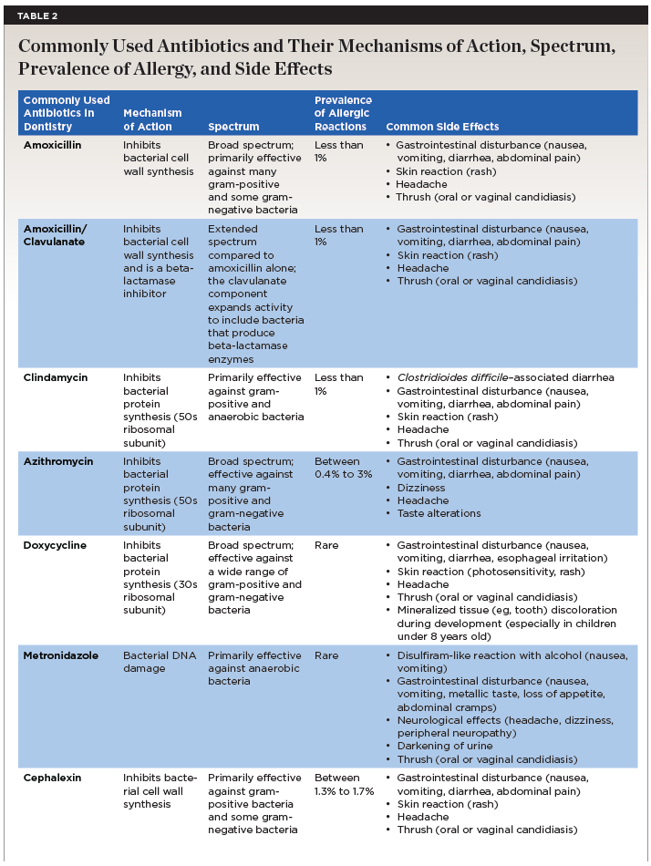 The mechanisms of action, spectrum of microbial targets, and potential adverse reactions associated with common antibiotics used in dentistry are presented in Table 2.