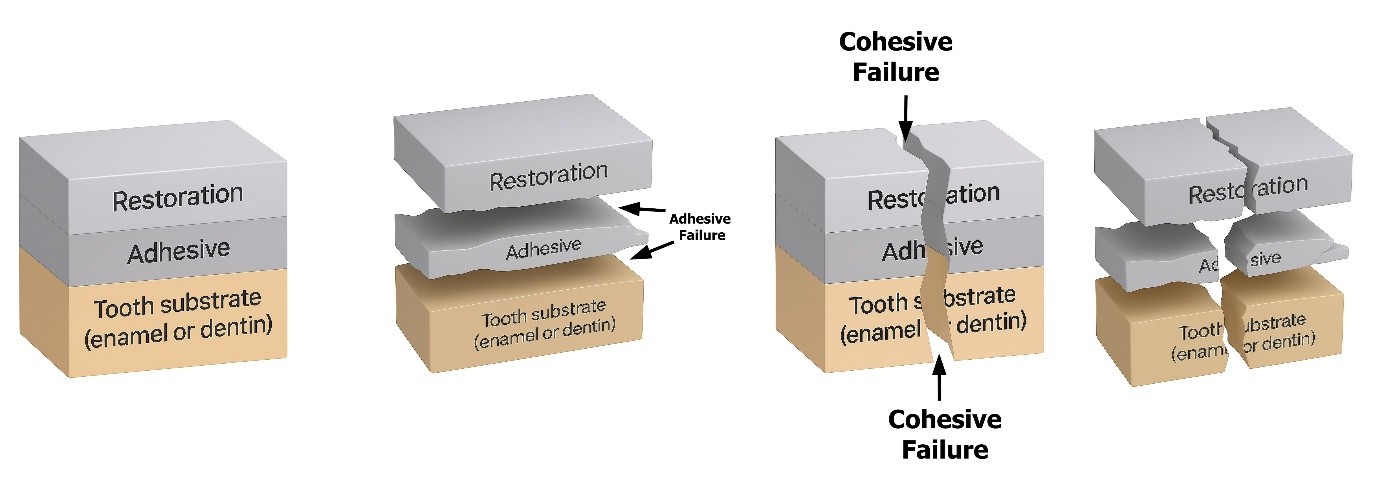When a restoration fails, the first step is to identify where the failure occurred, because this determines how the surfaces should be treated. Failures are generally classified as adhesive, cohesive, or mixed. An adhesive failure occurs exactly at the interface—either between the tooth substrate (enamel or dentin) and the adhesive, or between the adhesive and the restoration surface. Essentially, the bond between the two substrates did not hold, leaving one side completely clean after separation.3