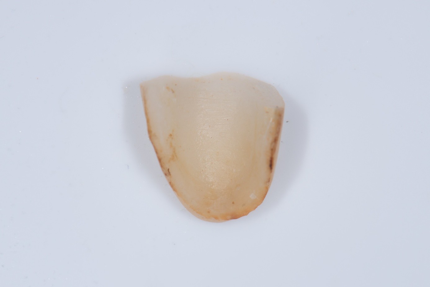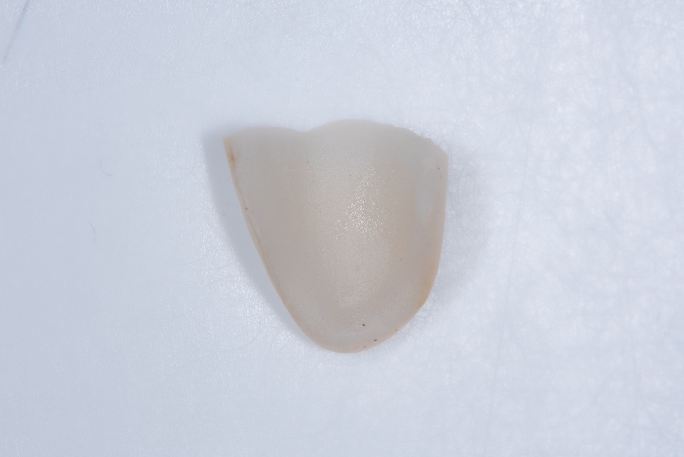 This case involved a patient with generalized mild anterior wear and an existing composite restoration on the maxillary left central incisor. The restoration extended from the middle third to the incisal edge and had excellent shade match and no marginal discoloration. The patient presented with a fractured central mesial portion of the composite (Figure 14 through Figure 16). Examination revealed a mixed failure pattern: Some adhesive and composite remnants remained on the tooth surface, while the fractured piece showed no residue internally. This finding suggested that the weak point was at the interface between composite and adhesive layer, with a minor cohesive component within the composite itself (Figure 17).