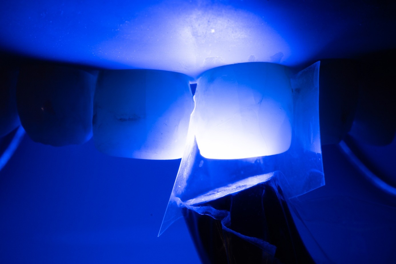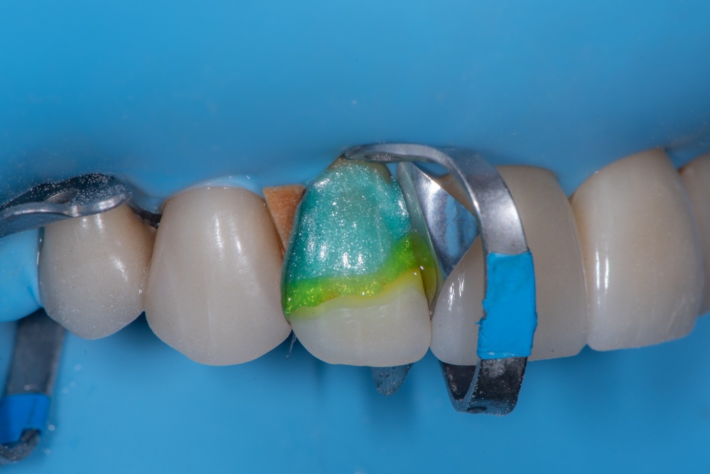 Intraorally, absolute rubber dam isolation was achieved to ensure a contamination-free environment (Figure 30). The prepared tooth was air-abraded with aluminum oxide to clean the surface and increase surface energy. A primer and bonding agent were applied to the tooth surface.