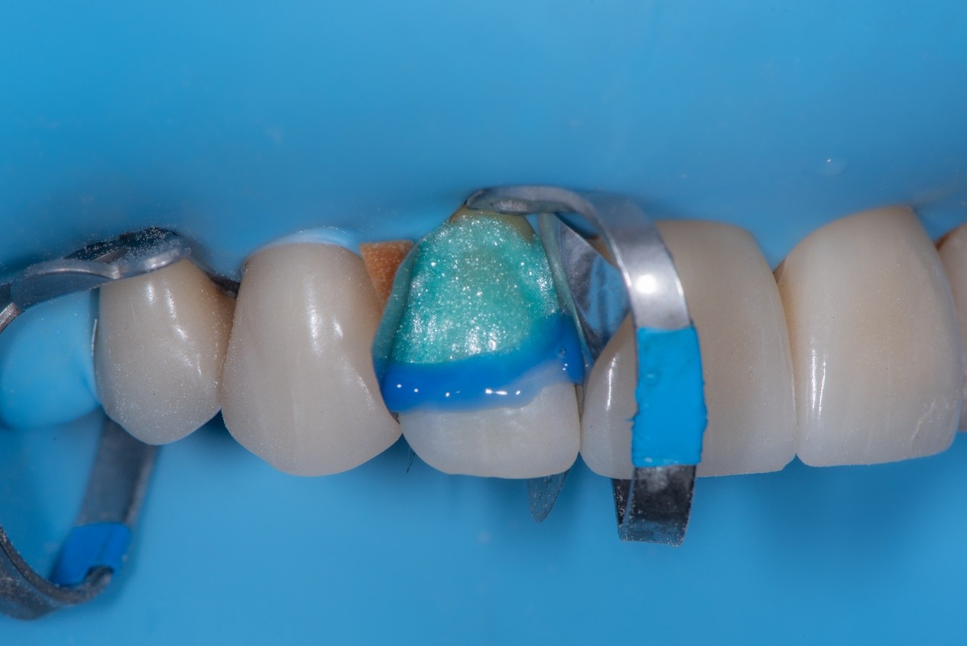 The enamel margins were etched with phosphoric acid, rinsed, and dried (Figure 34). A primer and adhesive were applied to both the tooth and the cusp fragment but were left unpolymerized at this stage to allow for chemical coupling (Figure 35 and Figure 36). A layer of heated packable composite resin was applied to the fractured interface, and the cusp was carefully repositioned in its original place. Excess adhesive and composite were removed with a microbrush, and the restoration was light-cured thoroughly from multiple angles.