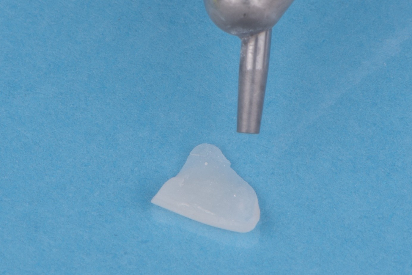After shade selection and clinical photos, absolute isolation with a rubber dam was achieved. The intaglio surface of the fractured piece was air abraded with glass beads at 2 bars of pressure to remove residual cement. Aluminum oxide powder should be avoided on glass ceramics, as it tends to create microcracks and has shown to decrease bonding strength (Figure 4 and Figure 5).4 The fractured piece was etched with 9% hydrofluoric acid for 120 seconds followed by thorough rinsing for 20 seconds, then scrubbed with 37% phosphoric acid for 60 seconds and placed in an ultrasonic bath for four minutes in distilled water, rinsed, dried, and treated with silane to promote chemical bonding and heat treated at 100 °C for 5 seconds (Figure 6).5,6 The combination of the phosphoric acid scrub and the ultrasonic bath after HF etching helps to remove any calcium salt residues created during HF etching.