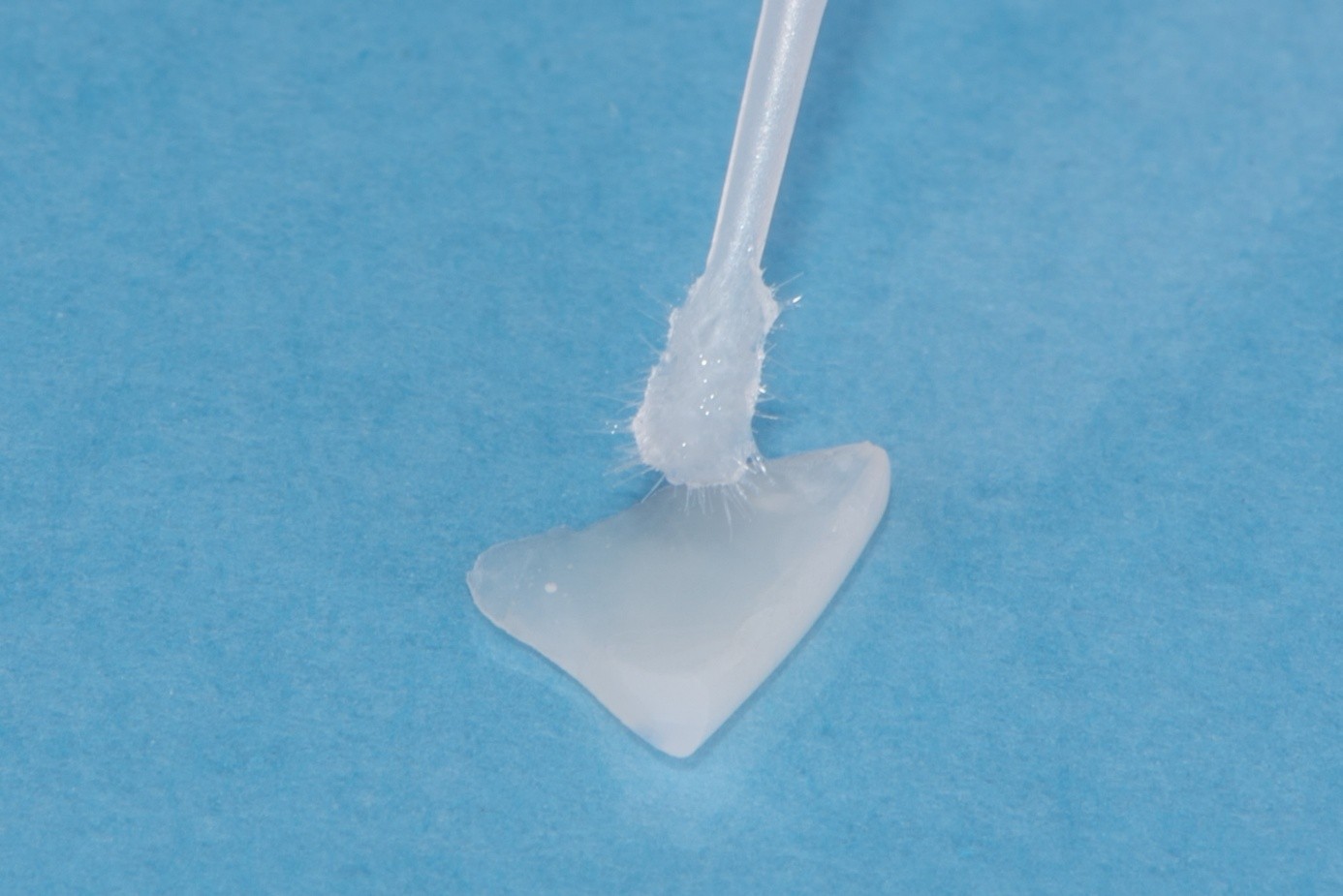 On the tooth side, exposed dentin was protected with a liquid dam (OpalDam, Ultradent) during ceramic conditioning to prevent HF contamination and maintain bond strength and scrubbed with phosphoric acid and rinsed and dried (in a similar manner as the fractured piece), and silane applied (Figure 7 through Figure 9). After surface cleaning, the tooth surface was air abraded with 30-micron aluminum oxide (RONDOflex, KaVo) with care taken not to air abrade the ceramic, then primed with adhesive using OptiBond FL (Kerr Dental) following manufacturer’s recommendations (Figure 10).