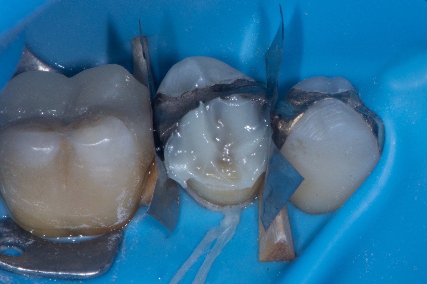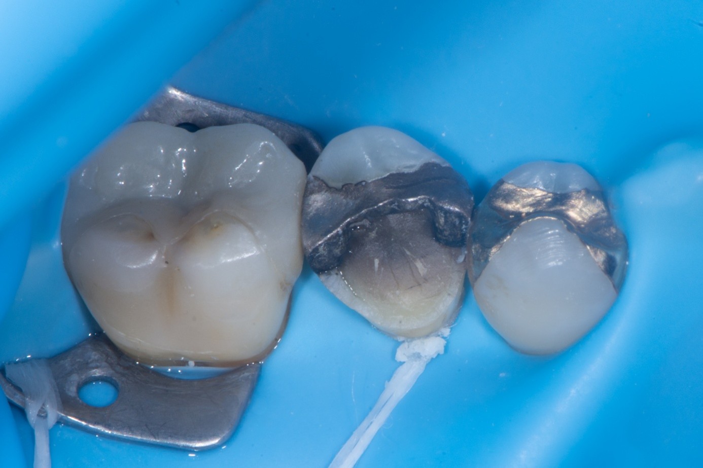 The ideal long-term management of this tooth would involve removing the amalgam, evaluating the remaining tooth structure, and placing a cuspal coverage restoration (e.g., indirect bonded onlay or full-coverage crown). However, given the urgency of the appointment and the patient’s desire for a quick, esthetic solution, a decision was made to re-attach the fractured cusp using an adhesive approach. This would immediately eliminate sensitivity, restore esthetics, and buy time before definitive treatment.13