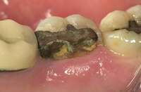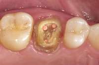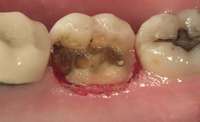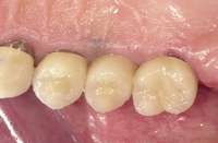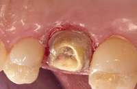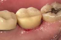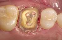 Digital impression systems are able to accurately image only those areas that are visible and isolated. A diode laser can remove obstructive soft tissues efficiently and provide a field that can be maintained free of blood and moisture.2 Therefore, these lasers can be invaluable restorative tools, making immediate analogue or digital impressions possible. Immediate restoration of teeth with ceramic materials during a single appointment is a hallmark of chairside computer-aided design/computer-aided manufacture (CAD/CAM) systems. With CAD/CAM systems, the operating field must be well isolated during the imaging process to record an accurate image of the cavity margins. Figure 1 illustrates a case of a porcelain crown with a temporary restoration after endodontic treatment. After the crown and temporary restoration were removed, the remaining cavity margin was subgingival, limiting access for imaging (Figure 2). A diode laser (Odyssey Navigator) was used to recontour the gingival tissues to establish good retraction and a dry field, and accurate images of the tooth were made immediately (Figure 3 through Figure 6). Electrosurgery has been a common choice of clinicians to excise gingival tissues effectively while simultaneously creating adequate hemostasis. Heat generation occurs to a degree where irreversible damage to the alveolar crest may result, leading to recession and exposure of restorative margins that may be objectionable to the patient.8 Careful control of the diode laser power settings and fiber tip movement ensure that the soft-tissue contours will not recede after healing and the margin placement will remain in the same position (Figure 7 and Figure 8).