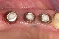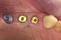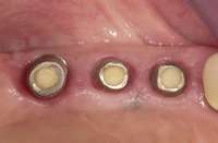 Soft-tissue lasers are also useful for creating the desired soft-tissue contours around implants because the diode laser does not interact with metals. At times, soft-tissue contours around healing abutments do not conform to the desired cervical contour of the planned restoration, such as when the gingival tissues heal against the parallel-sided healing abutment and restrict the cervical space for the abutment and crown. This contour may prevent complete seating of the final restoration as the cervical contours are developed in the final restoration (Figure 13). A diode laser can be used to modify the gingival contour to match the crown contour at delivery or temporization to create the desired tissue contours. The fine tip of a laser offers excellent control to create the desired tissue contours (Figure 14 through Figure 16).