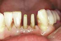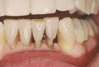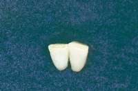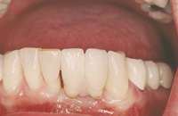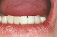 The mandibular incisors characteristically erupt with a series of three small mamelon. Typically the mamelon yield to attrition very early in their functional lives and disappear. From that point on, the widest part of the mandibular incisor is its incisal edge.12 Therefore, there can be no incisal embrasures on the labial aspect of these teeth. The irregularities and individualities one sees in compositions of mandibular incisors are manifestations of lingual, not labial anatomy (Figure 11 through Figure 13). This is a natural anatomic relationship that commonly is violated when mandibular anterior dental restorations are fabricated. The result is often the unattractive “picket fence” appearance (Figure 14 and Figure 15).
