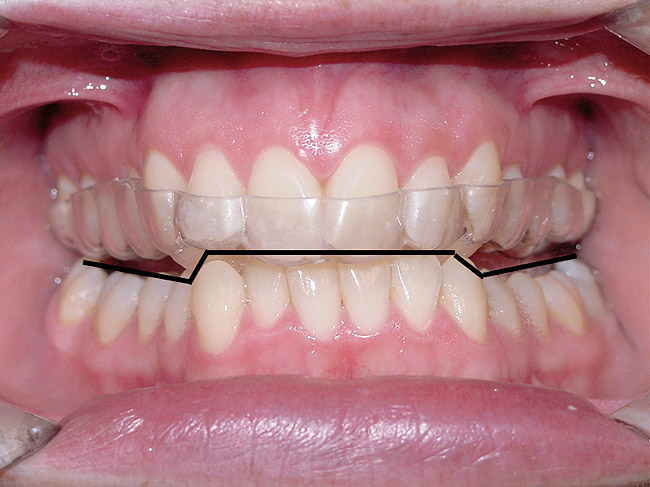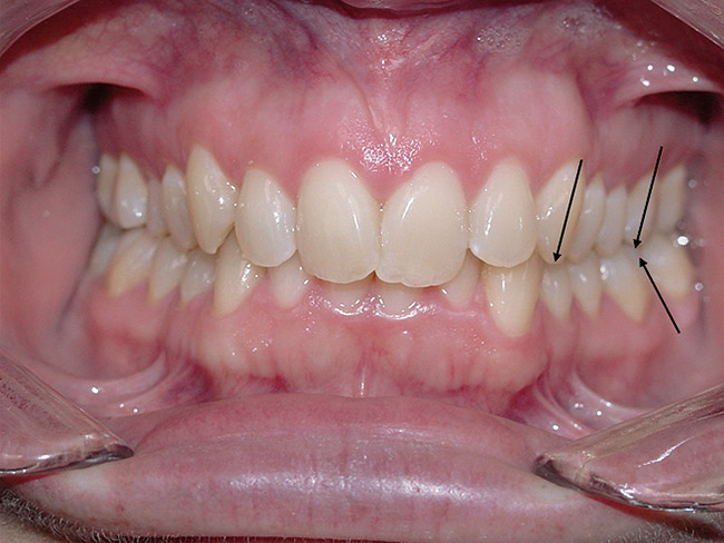 If the maxillary anterior teeth are positioned or inclined palatally, upon closure the lower teeth are going to first contact these teeth, which will force the mandible to shift to close into a retruded position. The objective is to try to identify this shift from primary contact to closure. This type of fence could potentially lead to shifting of the maxillary anterior teeth, breaking of the teeth, and/or muscular and jaw dysfunction as a result of posterior displacement of the mandible (Figure 2, Figure 3, Figure 4 and Figure 5).