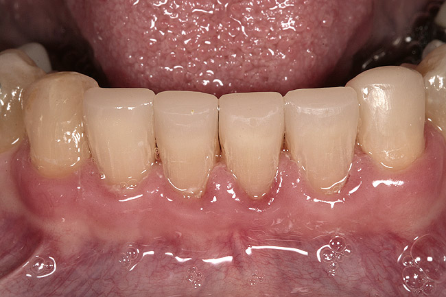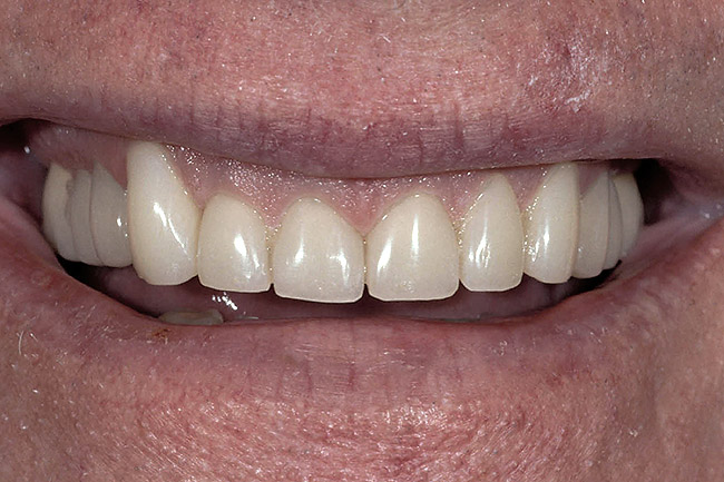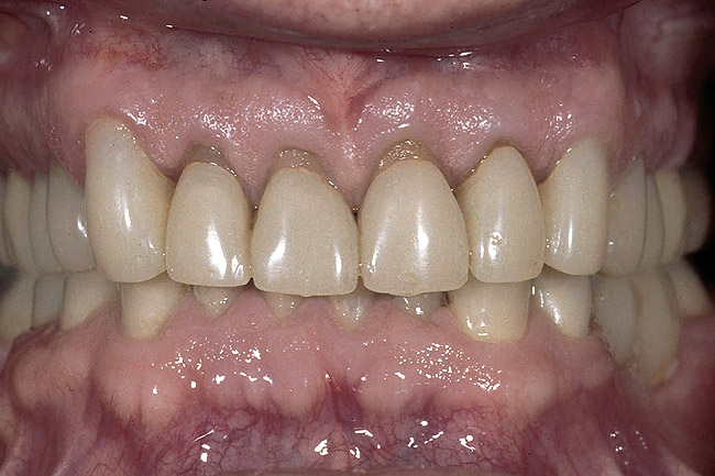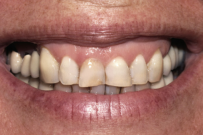 There are several methods for identifying the correct incisal edge position pre-surgically, including the use of an overlay matrix, altering the contour of the existing teeth using reshaping or bonding, and preparing the teeth and placing temporaries.15 The patient who almost always requires tooth preparation and temporaries in order to correctly identify the incisal edge position is the one with severe wear and a need for the addition of significant length to the incisal edge of the existing teeth. Because there are such significant functional concerns in altering the incisal edge position of these patients, using a simple removable overlay to identify the esthetic position of the incisal edge and gingiva is risky. Instead, it is much more predictable to lengthen the teeth temporarily to evaluate the esthetic and functional success of the new incisal edge position prior to any crown lengthening. If the teeth are amenable to direct bonding to alter incisal edge position, this is often the best approach to temporization. If, on the other hand, the teeth are severely worn and bonding is not realistic, it will probably be necessary to prepare them and place temporaries to evaluate the change. Once it becomes clear that the new incisal edge position is acceptable both esthetically and functionally, the periodontal surgery can be completed to correct gingival levels and, therefore, crown length (Figure 6, Figure 7, Figure 8, Figure 9 and Figure 10).