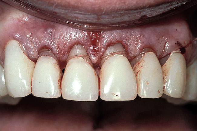The most common reasons to place temporaries prior to periodontal surgery relate to the needs for correctly identifying incisal edge position prior to surgery, or gaining access to an edentulous site for ridge augmentation or implant placement when an existing bridge is present. Whenever anterior crown lengthening for esthetic reasons is planned, it is critical that the incisal edge position be identified prior to surgery.12 This is important because, ultimately, the goal of surgery is to position the tissue to create a pleasing tooth size relative to the correct incisal edge.13,14