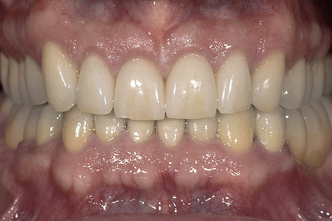 In orthodontic treatment of adult patients, a common problem regarding tooth form is wear.9 As in the case of malformed teeth, it is always easier to correct the tooth form prior to the completion of orthodontics. Often, if this is not accomplished, the orthodontist will level the arches, aligning the incisal edges of the worn teeth and leaving the patient with the options of having periodontal crown lengthening or living with short teeth. A far more appropriate treatment is to correct the length of the worn teeth temporarily before or during the orthodontic treatment. This results in level arches with correctly positioned and sized teeth.