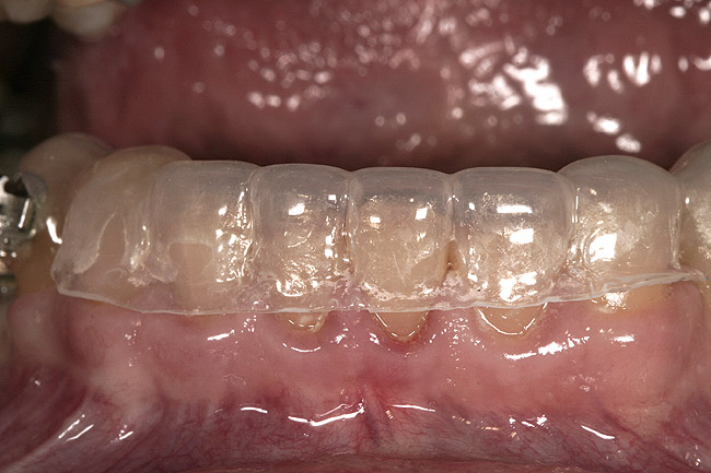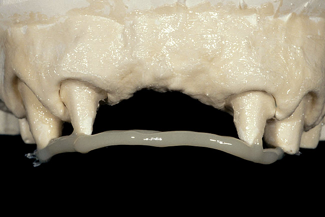 To reinforce temporary restorations, begin by preparing the teeth and making an impression of the preparations. Pour the impression with one-third die stone and two-thirds mounting stone, so it sets quickly. Then ensure that the matrix fits the model. The fiber can now be placed across the preparations on the model and tacked into place with flowable composite. Once the fiber is positioned, try the matrix back on to verify clearance between the fiber and the matrix. If the clearance is acceptable, remove the matrix and reinforce the fiber by adding more flowable composite across its length. Finally, lubricate all areas of the model with petroleum jelly or foil substitute, keeping all lubricant off the fiber. Then, load the matrix with the desired temporary material and seat it over the preparations and the fiber. After curing, it can be trimmed and seated in the patient’s mouth (Figure 17, Figure 18, Figure 19, Figure 20 and Figure 21).