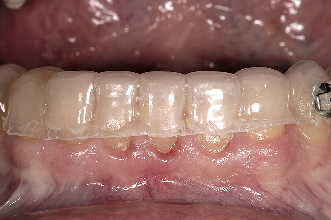 The orthodontic set-up and wax-up are used to determine the correct shape for each tooth. Once the tooth shape has been corrected, the patient returns to the orthodontist for replacement of the brackets and archwires. As the orthodontist completes the treatment, they can now move the teeth into the correct positions because the form has been corrected. Not having to attempt to hold a malformed tooth in place, but rather being able to close the arch with interproximal contact on all teeth and level the arch with the correct tooth length, makes the treatment much more predictable.