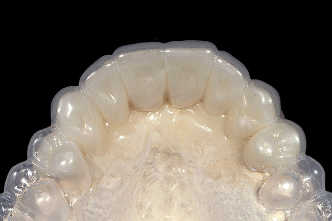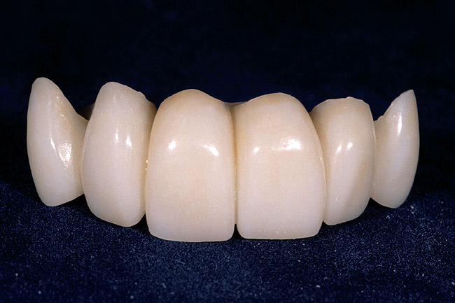 The key is to use a very accurate diagnostic wax-up of the desired tooth shape.16,17 An alginate impression is then made of the wax-up, and the impression poured in stone. This stone replica of the diagnostic wax-up is used to make a clear, pressure formed 1.5-mm matrix. The matrix is tried in the mouth, and any areas on the teeth that should be modified in order to ensure that the matrix fits are adjusted. All the teeth are then etched, adhesive is applied, and the matrix is loaded with composite and seated. The composite is then cured through the matrix, the matrix peeled off and, using finishing burs, the embrasures refined. A saw can be used to separate the teeth, which were basically created as one block of composite. This technique has allowed me to bond multiple teeth to a predictable form very quickly. If your composite is stiff, warming it in hot water can facilitate a better flow when seating the matrix.