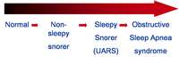 Obstructive breathing disorders fall on a continuum beginning with snoring, continuing with upper-airway resistance syndrome and hypopnea with associated hypoxemia, and ending with sleep apnea (Figure 4).An apnea is defined as the stoppage of breathing for 10 seconds or more.7 If the stoppage of breathing is caused by an obstruction in the airway, it is called an obstructive sleep apnea. Obstructive apneas are a result of the blockage of the airway, either at the junction of the oropharynx (soft palate and base of the tongue) or anywhere else in the pharyngeal anatomy (Figure 5).When the blockage occurs in the pharynx because of muscular collapse at that site, the pharynx is said to be compliant.
