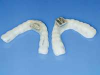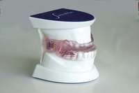 | Figure 7 The author’s preference is to use appliances with anterior midpoint stops for parafunctional control. | Figure 8 The TAP® III (Comfort Acrylics, Inc, Camas,WA) is a Thornton Anterior Positioner. This version has thermacryl on the interior that allows for easy adaptation with dental changes. | Figure 9 The TAP III is titratable by the patient. Titration of this appliance will control the protrusion of the mandible. Both the TAP and SomnoDENT provide patient-friendly titration, which is extremely helpful as adjustments are made to assure comfort and yet provide adequate muscular tension. |