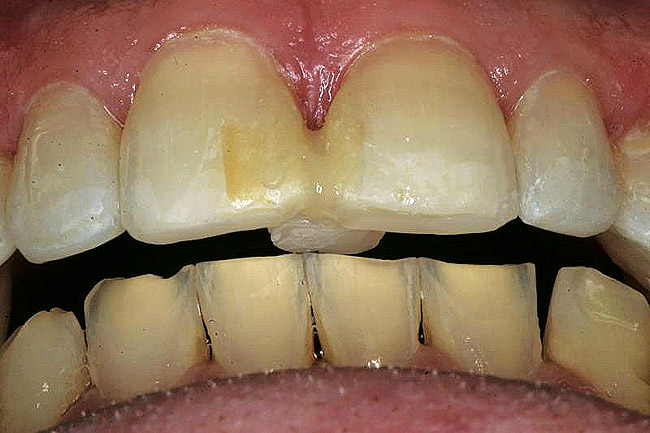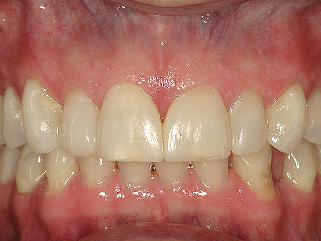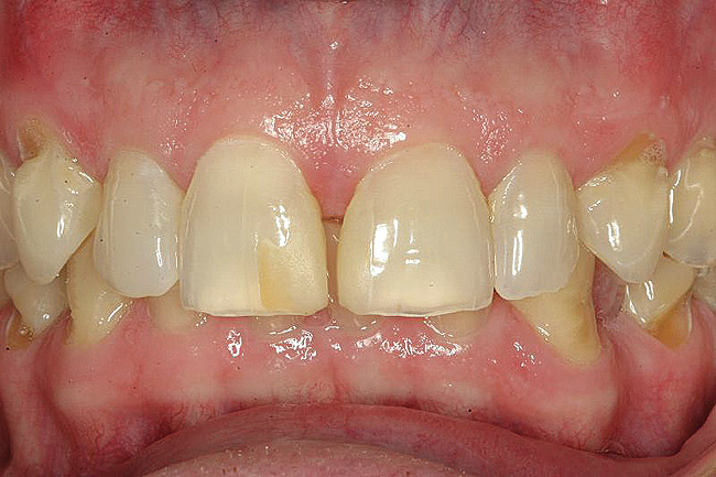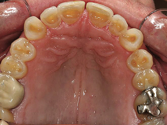 A 55-year-old patient was referred to the office with a severe (grade III) generalized loss of enamel and dentin. The patient was aware that his teeth were becoming thinner and was concerned that some of the anterior teeth might fracture (Figure 1). The patient was not aware of any systemic problems and did not have severe symptoms of acid reflux. Before proceeding with dental treatment, the patient was referred to a gastroenterologist for a full diagnostic exam. After the diagnostic exam, which included the monitoring of acid regurgitation and pH while the patient slept, a final diagnosis of GERD was rendered. The patient was treated with a gastric secretion suppressor medication (Prilosec®, Procter & Gamble, Cincinnati, OH) that inhibits the hydrogen/potassium ATP-ase enzyme system in the gastric parietal cells of the lining of the stomach. It is considered a gastric acid pump inhibitor because it works by blocking the final step of acid production.