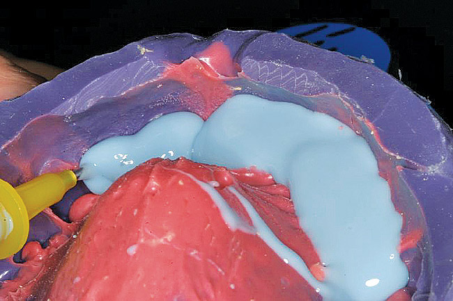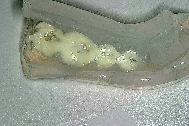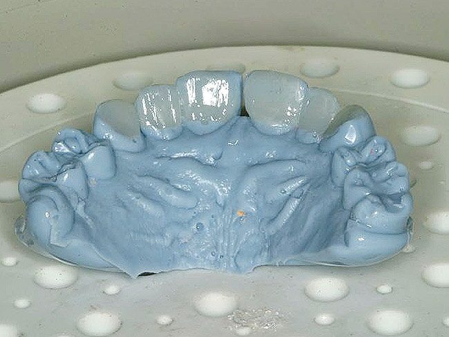Once the wax-up was completed, PVS impressions were made to set up a matrix to form the new restorations in the posterior. The polyether impressions were injected with the silicone die material (Figure 9) and allowed to set for 2 minutes. The silicone die material was then removed from the impression and hybrid composite was added to form the lingual veneers (Figure 10). This was done freehand and only enough material to replace what was missing was added. This is how the new vertical dimension was determined. A clear polyvinyl matrix also could have been used for fabricating these restorations. The composite was light-cured and then placed in a Triad® unit (DENTSPLY Trubyte, York, PA) for final light-curing (Figure 11), which should make the restorations stronger. The restorations were finished and polished using finishing disks and polishing points (Figure 12) after first being micro-etched with 50-µm aluminum oxide powder, then etched with hydrofluoric acid (Figure 13) for 90 seconds, and finally silanated. The restorations were adhesively bonded with resin cement and then tried in the mouth for fit (Figure 14), before being cleaned in an ultrasonic bath with acetone. The teeth were isolated with an Expandex retractor (Parkell) and micro-etched using aluminum oxide powder (Figure 15) for 20 seconds (Figure 16) with Ultra-Etch (Ultradent, South Jordan, UT), then rinsed and air-dried. A fourth-generation bonding system (All-Bond 2®, Bisco) was used for its excellent bond strength. The two-part primer was mixed in a dispensing well and applied in numerous coats to the moist surface (Figure 17). This was followed by an application of the unfilled D/E resin (Bisco). The restoration was treated with D/E resin and Insure resin cement (Cosmedent). The adjacent teeth were protected from the etchant and adhesive by using Teflon® tape (E. I. du Pont de Nemours and Company, Wilmington, DE). The restorations were seated one at a time and light-cured for 40 seconds on the lingual and facial aspects. Figure 18 shows the first three restorations placed and the same procedure was followed for the remaining anterior restorations.