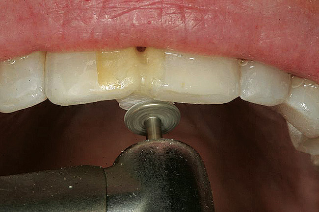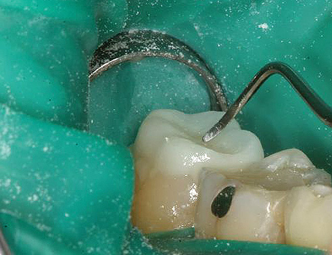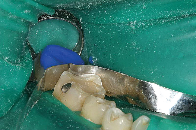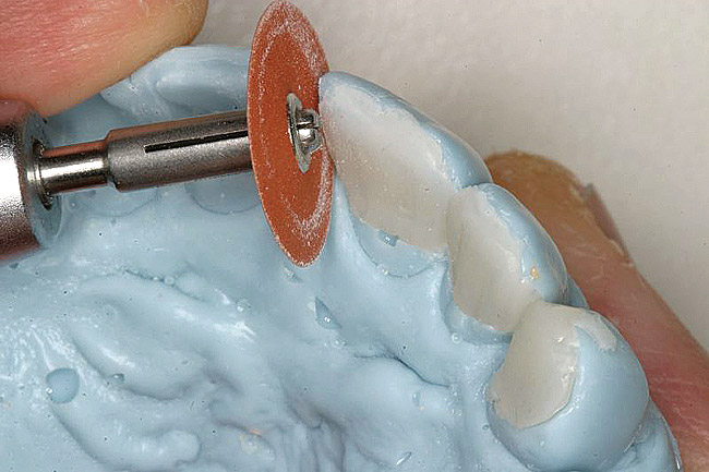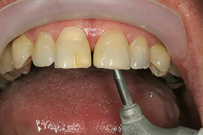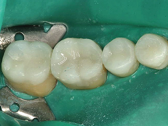 Rubber dam isolation was used in the posterior for ideal moisture control. The teeth were etched with a microetcher first (Figure 23) and then etched with phosphoric acid. The same bonding protocol was used as the anterior restorations. To keep the etch from the adjacent teeth when bonding, a Brasseler serrated saw blade (Brasseler USA, Savannah, GA) was inserted interproximally because the contacts were not broken (Figure 24). A clear matrix would not go through the contacts. The restorations were then bonded individually (Figure 25) and the resin cement cleaned up. Figure 26 shows the lower right quadrant bonded to place before removing the rubber dam.