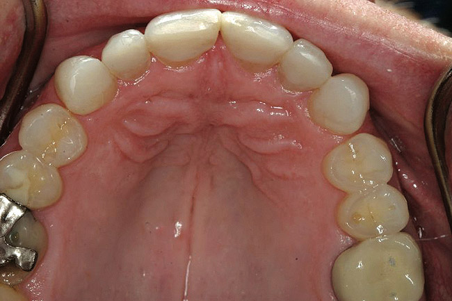 Once all of the posterior restorations were bonded to place, final equilibration was necessary. A composite platform was fabricated and placed on the lingual side of the upper anterior teeth, similar to using a Kois deprogrammer (Figure 27). The platform was retained mechanically by the diastema without any adhesive. The patient lightly occluded on the platform for about 15 minutes to allow the muscles to relax. The platform was then slightly modified (Figure 28) to allow the first tooth to touch. This would represent the initial contact in centric relation. Equilibration was then carried out until even, simultaneous contacts were present on all the posterior teeth and cuspids. The final equilibration, to remove any interference on the lingual of the anteriors when chewing, was accomplished with the patient chewing gum in the posterior zone while placing 200 µm articulating paper in the anterior zone. Only streaks and aberrant lines needed to be removed as these illustrate areas of friction within the envelope of function.