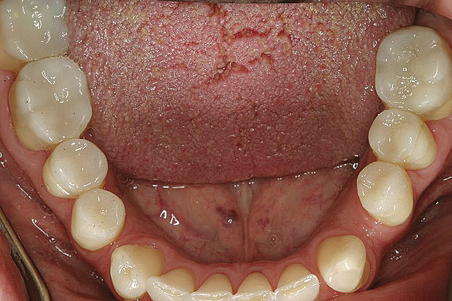 The pulps of numerous teeth were nearly exposed, particularly in the anterior region. Occlusal analysis revealed a Class I molar relationship. There was minimal to no overjet and almost 100% overbite. Because of the severe wear of the teeth, it was possible that the vertical dimension of occlusion was lost, but it would be only possible to confirm this if the patient had cephalometric x-rays from years ago that could be compared with their current appearance.
