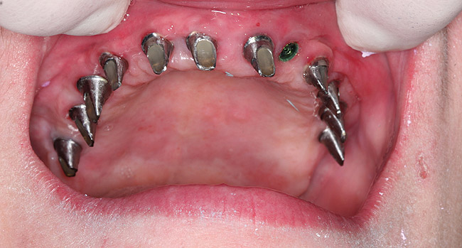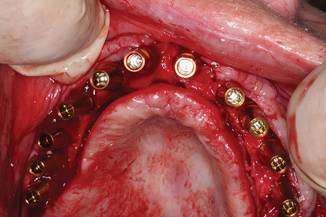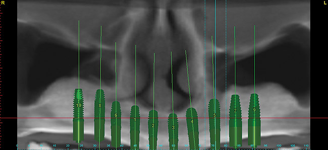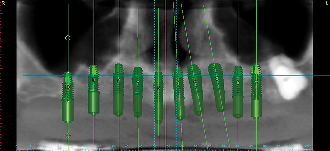 A DFDBA bone-graft putty (Regeneform) was used to graft the entire maxillary arch. All extraction defects were degranulated, the bone was decorticated to allow bleeding, then the DFDBA putty was placed and covered with resorbable collagen membranes (Biomend Extend, Zimmer Dental) (Figure 5). Primary closure was obtained and the patient wore her denture after a soft reline for a period of 6 months (Figure 6). At 6 months post-graft, a CBCT scan revealed substantial graft material from both an axial (Figure 7) and a crosssectional view, showing more than 15 mm of bone height (Figure 8). The 3D view from the CBCT also showed substantial ridge changes in both height and width (Figure 9). Using a CBCT software program (SimPlant, Materialise Dental Inc, Glen Burnie, MD), implants were planned for placement (Figure 10). As per the CBCT plan, 11 internal hex implants (BioHorizons, Birmingham, AL) were placed in the grafted bone (Figure 11). The ideal bone height allowed implant placement in an ideal position with relation to esthetics and occlusion.