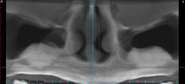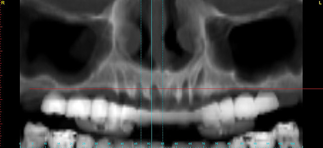 A 53-year-old woman in good health presented for the replacement of missing teeth on the maxillary arch and periodontal therapy of the mandibular arch. A CBCT scan was taken that revealed the need for bone grafting on the maxillary ridge and maxillary sinus areas in the panographic (Figure 14) and axial (Figure 15) views. Bone loss was noted on the facial plate areas of the anterior ridge. A treatment plan was created to graft the maxillary ridge and sinuses bilaterally, and then to place 12 dental implants to support a fixed prosthesis on the maxillary arch.The treatment plan for the mandible consisted of periodontal surgery to save her remaining teeth.