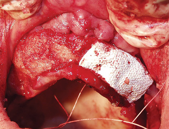 Thermoplastic DFDBA putty graft materials offer a tenting effect that helps to protect the graft from movement and supports the membrane. Collagen membranes offer the advantage of protecting the graft and a second surgery is not required to remove it. Another advantage of DFDBA putties is their ability to mold into the defect with ease. This can be attained with a glove wetted with saline. This is in contrast to many particulate materials that tend to migrate from the site, particularly when placed in an aqueous environment.