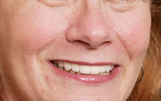 Through grafting, an ideal crown-to-implant ratio was obtained with relation to the final prosthetic position. A panograph reveals implant placement (Figure 12). Esthetically, the patient ended up with a fixed implant-supported prosthesis that approximated her natural tooth position (Figure 13).