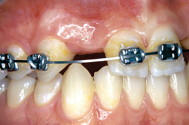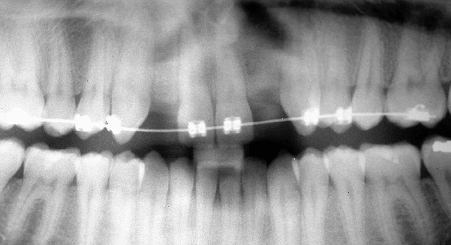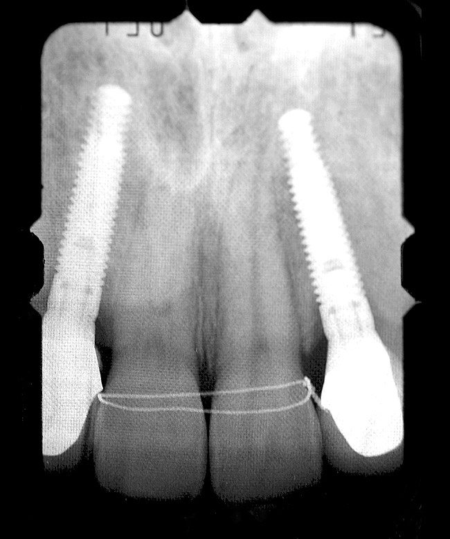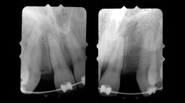 Based upon the intraoral examination and periapical radiographs, additional orthodontic intervention was recommended to move and rotate the roots to gain enough space for implant placement. This information was conveyed to both the parents and to the treating orthodontist.