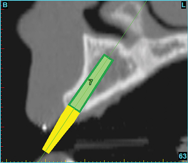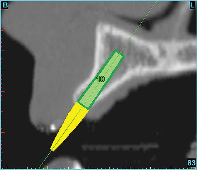 After reviewing the CT data and the decision tree, the bone within the “zone” of the TOB was evaluated and found to be satisfactory for implant placement. Because the goal of implant dentistry is not the implant but the tooth that is placed, true restorative-driven implant dentistry must begin with the assumption that the implant position should remain consistent with the tooth it is replacing, and the final implant-supported restoration.12,22-26 The TOB aids the clinician in understanding the link between the implant position and the desired restorative goal. The base of the geometric shaped “zone” is visualized by starting at the widest area of alveolar bone facially and superiorly. The apex of the triangle is positioned to bisect the alveolar crest (Figure 7). The TOB, the overlay in the cross-sectional image, reveals whether adequate bone is available for implant placement. It also helps to identify concave facial bone defects, and accurately determine the width of bone at the crest. The author recommends using an interactive software application that provides the necessary measurement tools to accurately assess the bone anatomy.