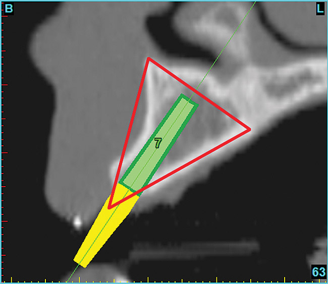 Using the interactive treatment-planning software application, the scan data was assimilated and both potential lateral incisor implant receptor sites were evaluated. It is a combination of the data and the methodology used to interpret the data that is the basis for defining a new paradigm in diagnosis and treatment planning. Proper evaluation of these images and correct use of the interactive treatment planning software tools is essential in creating a decision tree of treatment options. First, the data from the scan was reformatted into panoramic, axial, and cross-sectional images. The undistorted cross-sectional images revealed the residual alveolar bone in the area of the right lateral incisor. Then, a simulated schematic implant was placed within the bone with an abutment extension to help visualize the connection to the restorative position of the tooth (Figure 6). The Triangle of Bone® (TOB), a concept developed by the author to analyze bone quality, quantity, and disposition at prospective dental implant sites using CBCT scans, aided in determining available bone volume by defining a “zone” for proper implant placement18,19 (Figure 7).