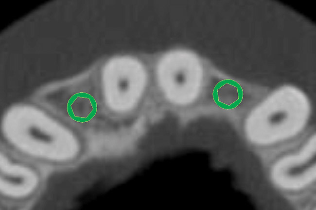 The CT axial views represent an important instrument in gaining a better understanding of anatomical features that cannot be determined by any other imaging modality (Figure 10). When the maxilla is sliced axially at the level where the roots meet the crest of the bone, the adjacent and surrounding root morphology can be revealed. Of note are the individual and different shapes of each of the central incisors, canines, premolars, and molar roots. These images reflect a phenomenon defined by the author as the “restorative dilemma.” Clinicians encounter this often difficult dilemma when attempting to re-establish morphologically correct emergence profiles in prosthetic teeth as they ascend from the round shape of the implant(s). When planning for the placement of the implant in the left lateral incisor area, there appeared to be adequate mesial-distal space between roots as seen in the axial view of Figure 11. A closer inspection of the planned site for the right lateral incisor revealed a more narrow space, further complicated by the distal rotation of the palatal aspect of the tooth root. Based on this preliminary position, the 3.75-mm diameter, straight-walled implant can be seen encroaching on the lamina dura periodontal ligament space of the right canine and central incisor. If there was not adequate room for this diameter and type of implant, the adjacent teeth could sustain potential iatrogenic damage. Therefore, additional “tweaking” of the virtual placement was necessary to diminish this risk.