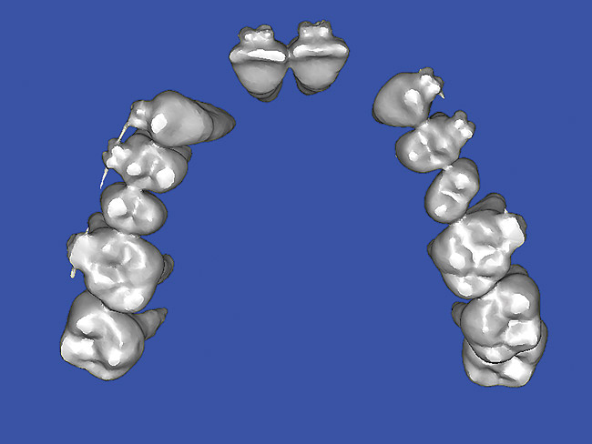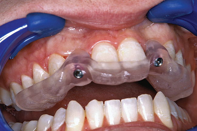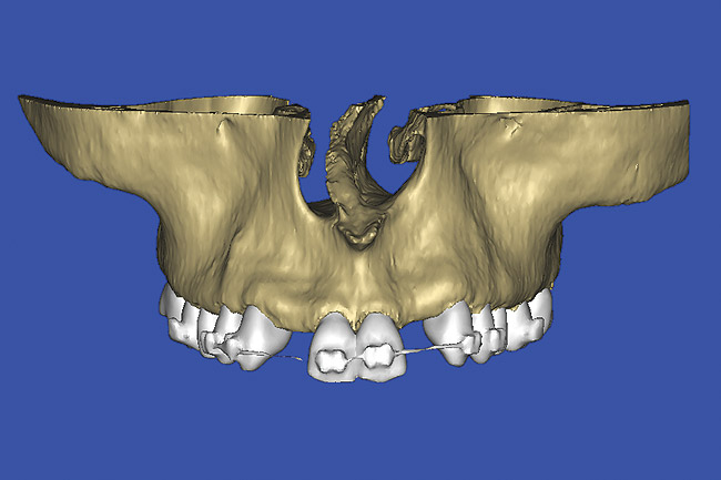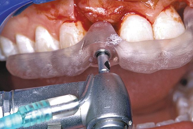 Before the day of surgery, the patient was seen by the orthodontist for the removal of the orthodontic brackets. The patient still was not pleased with the position of the two centrals, and it was determined that this would be addressed after implant placement (Figure 26). The anatomical variations of the crestal tissue and lack of interdental papilla can be appreciated in the close-up views of the right and left sites (Figure 27 and Figure 28). There were no surprises on the day of surgery as all of the decisions were made during the planning phase, before the scalpel ever touched the patient. The occlusal view of the CT 3D model revealed the wider alveolar ridge on the right side and thinner crest on the left side (Figure 29). This was confirmed when the full-thickness mucoperiosteal flaps were elevated, and the underlying bone revealed (Figure 30). The tooth-borne templates were designed to facilitate the drills and drilling sequence specific to the diameters of the predetermined implants (Figure 31). Each template contained an embedded 5-mm long stainless steel tube, which was approximately 0.2-mm wider than each drill (just wide enough to allow for the drills to rotate freely). Once positioned over the natural teeth, the template was secure and offered precision accuracy in transferring the implant locations from the original software-designed plan, allowing the potential for internal and external irrigation (Figure 32).
