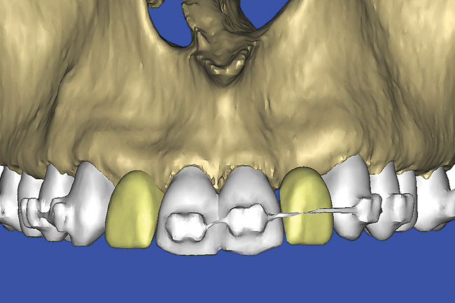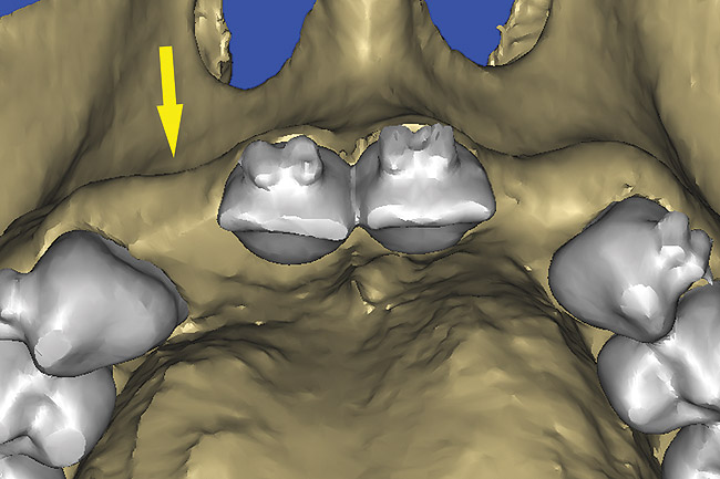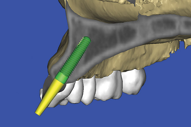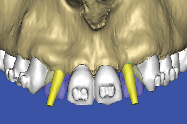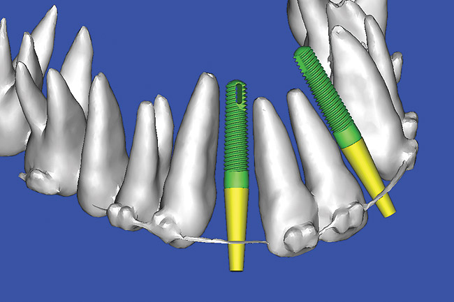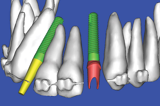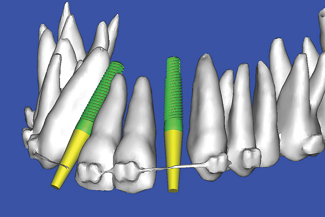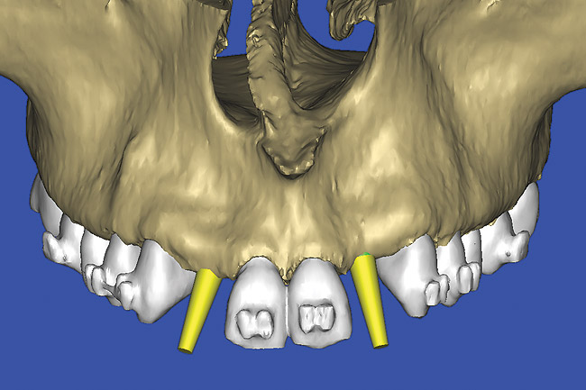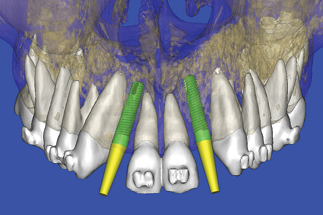 After the basic plan had been established, it was re-evaluated using interactive 3D images. The reconstructed 3D view of the maxilla clearly illustrated the extent of the bilateral facial concavities, and the root eminences of the adjacent and posterior teeth (Figure 12). The placement of the virtual implants then was evaluated to ensure that the facial cortical plate was not perforated (Figure 13). The implants were labeled individually as “7” and “10,” with the simulated yellow abutment projection indicating the facial-lingual inclination through the bone to the level above the incisal edge of adjacent teeth. The ability to gain a better understanding of these individual root forms cannot be underestimated. The dental literature has suggested certain parameters for placing implants near teeth and implants next to other implants. However, there is little scientific 3D documentation to support these suggested rules.5-10 The use of an interactive treatment-planning software application permits closer scrutiny of previously difficult-to-visualize areas, and can now be used to redefine perceptions of spatial positioning of implants, especially when in close proximity to natural tooth roots, vital anatomy, and adjacent implants.27-29