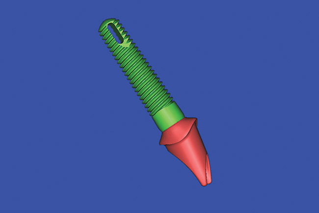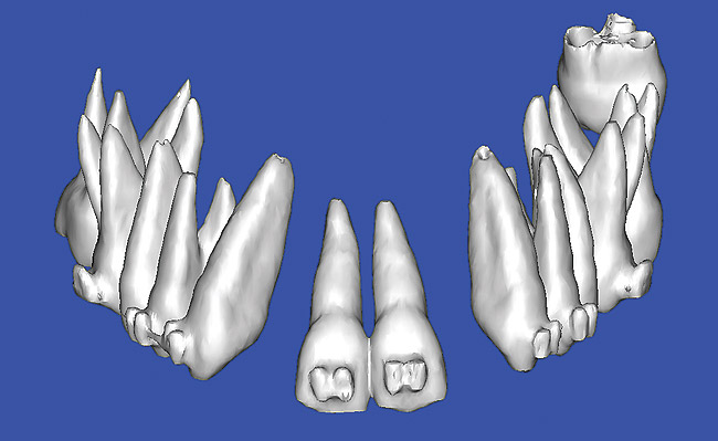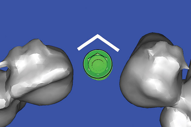 Using different masking (segmentation) and threshold Hounsfield unit values, several new 3D bone volumes can be created which offer invaluable information. To help determine the final position of each implant a new bone model was created with a Hounsfield unit value of 1480, which eliminated all but the densest objects included in the scan data. (Results may vary depending on the CBCT machine used.) The inner and outer layers of bone were removed, leaving the underlying enamel and root structure of the teeth (Figure 14). After the bone had been stripped away, the root inclinations were examined closely. The most striking findings confirmed the rotated position of the right central, while revealing the slight mesial dilaceration of the root apex, which converged on the space needed for the path of the potential implant (Figure 15). The schematic shapes of the proposed implants were visualized for the right and left lateral spaces in different rotations of the 3D maxillary arch. It was at this point that a determination was made as to the appropriate implant shape and type that would fit the available space while avoiding encroachment on adjacent tooth roots. A tapered design implant (Tapered Screw-Vent®, Zimmer Dental, www.zimmerdental.com) was chosen from the large virtual library. With the SIMPlant software, the virtual library contains data from dozens of implant manufacturers and realistic computer-aided design representations as seen in Figure 16 through the translucent bone. The position of the left implant can be visualized with adequate mesial-distal distance between adjacent tooth roots (Figure 17) and a more delicate placement (Figure 18).