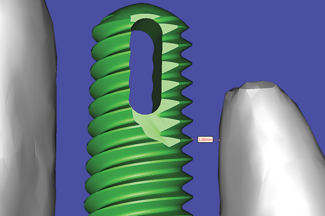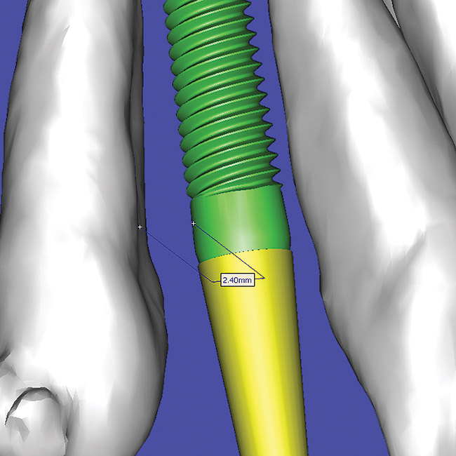 By using interactive treatment-planning software, the author was able to assess implant-to-tooth distances based on actual undistorted measurement of distances at both the crest (Figure 22) and the apex (Figure 23) of the implant. Additionally, the ability to section the 3D model allowed extremely accurate virtual implant placement, ensuring 2 mm of facial and palatal bone surrounding the implant (Figure 24). Using advanced masking tools, further manipulation of the 3D maxilla provided an unparalleled appreciation not only of the potential implant receptor sites, but also of the alveolar complex of each existing tooth and root morphology (Figure 25).