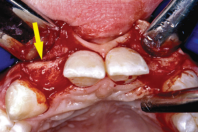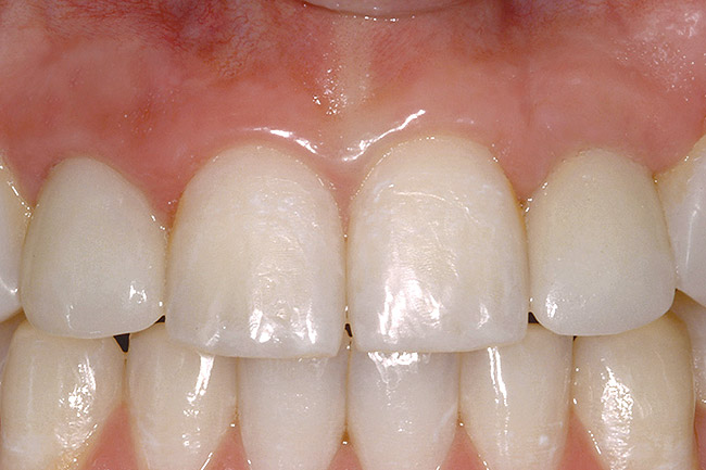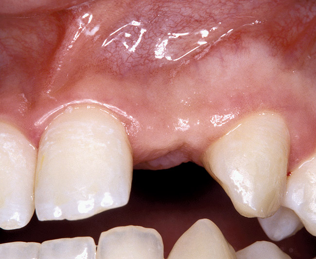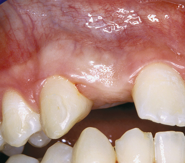 Periapical radiographs were taken to help determine the mesial-distal inclinations of the adjacent tooth roots (Figure 1). The radiographs revealed a serious issue, convergent roots for the right canine and right central, which eliminated that area as a potential implant-receptor site. The space between the left central and canine teeth was minimal, although the roots were relatively parallel. Clinical examination (manual palpation of the root eminences superiorly to the vestibule on the right side) confirmed the root convergence (Figure 2). The flat, wide zone of the keratinized tissue and lack of interdental papilla was evident for the missing right lateral incisor. There was a marked difference in clinical appearance for the left lateral, which could impact the eventual plan of treatment (Figure 3). Other significant clinical findings included bilateral facial bone concavities, which existed as a result of the congenitally missing tooth roots. As a diagnostic cue to the underlying bone topography, it is important to follow the demarcation between attached and unattached gingival tissue, and note the crestal width of the available keratinized tissue (Figure 4).
