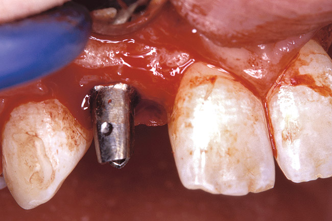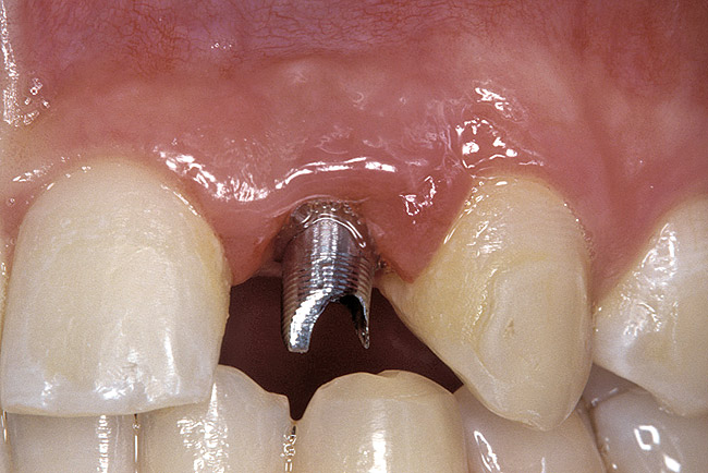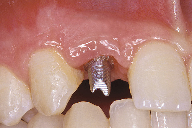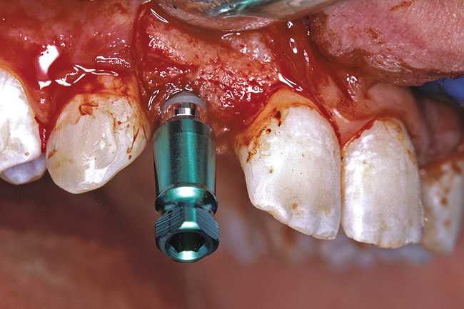 The 3.7-mm diameter Tapered Screw-Vent implant drilling sequence requires three drills: pilot, intermediate, and final sizing. Thus, three separate templates were fabricated to accommodate these sizes. The templates were removed easily and replaced with the next sequential size in less time than it takes to change the drill on the surgical handpiece. After the osteotomies had been completed, the implants were delivered to the site (Figure 33 and Figure 34). For this internal hex connection implant, the author recommends that the flat of the anti-rotational hex be positioned to the facial for proper orientation of the restorative components (Figure 35). Pre-prepared margins were created from a milled titanium fixture mount transfer post, which was delivered to the implant as support for an immediate transitional restoration. The facial “dot” helped to confirm the orientation of the abutment to the facially positioned flat side of the internal hex connection (Figure 36). Before cementation of the transitional acrylic restorations, a closed-tray, fixture-level impression was made, and a soft-tissue model was fabricated.