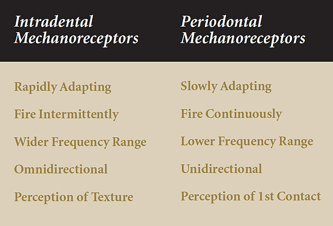 The author’s research confirms the presence of intradental mechanoreceptors and suggests endodontic procedures may limit patients’ abilities to perceive vibrations associated with textural assessment of objects with their teeth. In addition, the results show vibration perception thresholds are related to stimulation frequency, suggesting the conflicting results of earlier studies by Lowenstein and Rathkamp1 and Linden2 may be attributed to the different vibration frequencies delivered by their respective tooth stimulation methods.