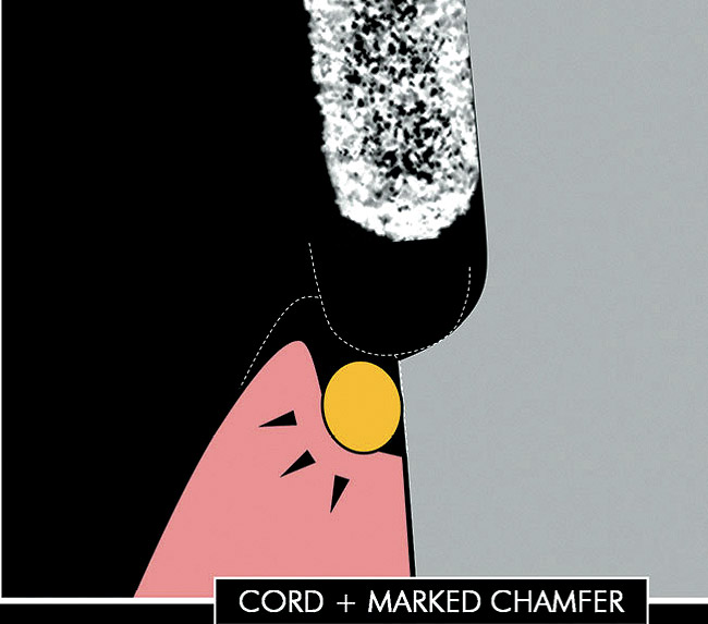 As mentioned earlier, DBA thicknesses can reach several hundred micrometers when applied to concave areas.19 When using IDS, the additional adhesive layer can sometimes negatively affect the thickness of the future restoration. This is particularly evident in the case of porcelain veneers and in the presence of gingival margins in dentin (Figure 2). When margins terminate in dentin, a marked chamfer (0.7 mm to 0.8 mm) is recommended to provide adequate margin definition and enough space for the adhesive and overlaying restoration (Figures 2A through 2C). A shallow chamfer would cause the adhesive resin to pull over the margin and compromise both margin definition and porcelain thickness.9 In other axial locations, confined and superficial dentin exposure gives only a limited space for the restorative materials, including the bonding agent. The application and curing of the DBA would significantly reduce the space left for the ceramic buildup. Considering that a low ratio of ceramic to luting agent thickness can negatively influence the stress distribution within the porcelain,32,33 IDS is not indicated for very superficial dentin exposures. On the other hand, deeper preparation surfaces (ie, in the presence of Class IV or V defects or in the case of inlay/onlay/overlay preparations) can be easily treated with IDS before impression taking because sufficient space is left for the restorative material to maintain a reasonable ratio of thicknesses between the ceramic and the luting agent.