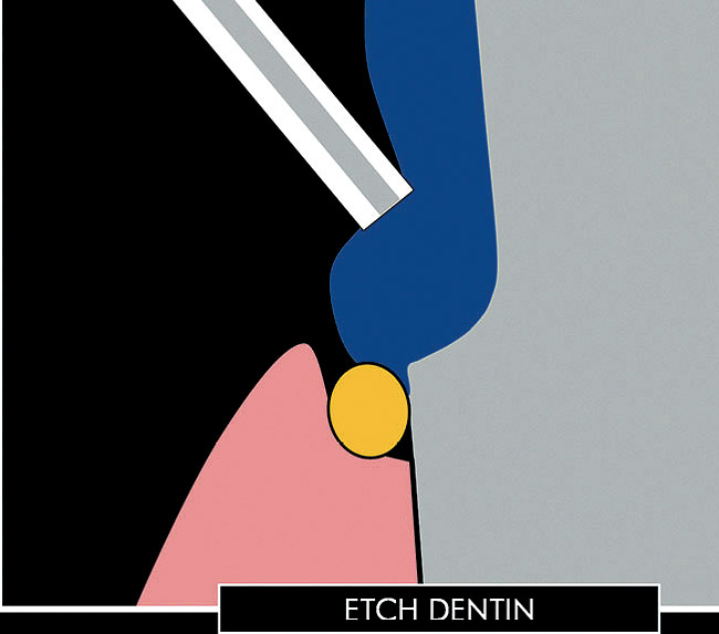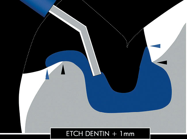 - Separate conditioning of enamel and dentin. As IDS is performed primarily on exposed dentin surfaces, the operator can focus on the "wet bonding" to dentin (in cases of total etching), whereas enamel conditioning can be performed separately at the stage of final restoration placement (see step-by-step procedure below).