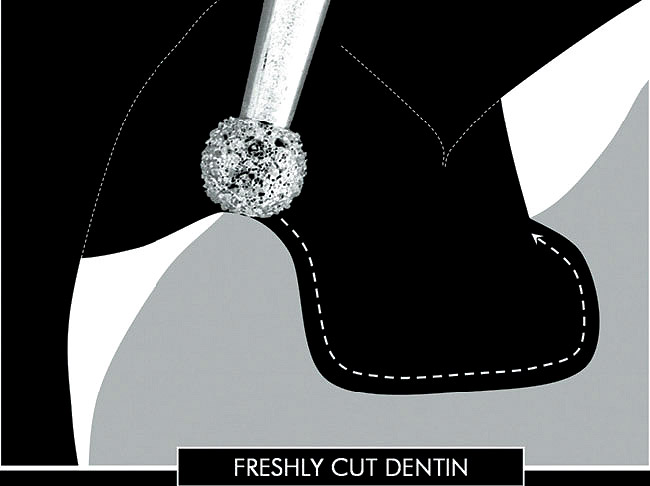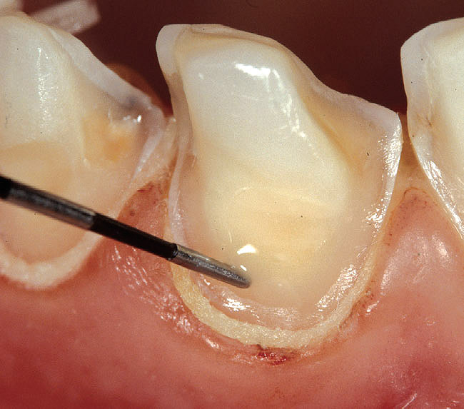 The first technical step for the application of IDS is the identification of exposed dentin surfaces. A simple but efficient method is to proceed to a short etching (2 to 3 seconds) and thorough drying of the prepared surfaces. Dentin can be easily recognized because of its glossy aspect, whereas enamel is frosty. It goes without saying that after this initial etch, the dentin surface must be reprepared (eg, a slight roughening with a diamond bur) to expose a fresh layer of dentin and re-etched before the application of the DBA.