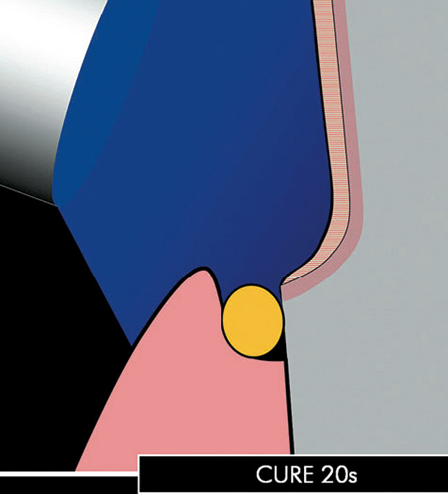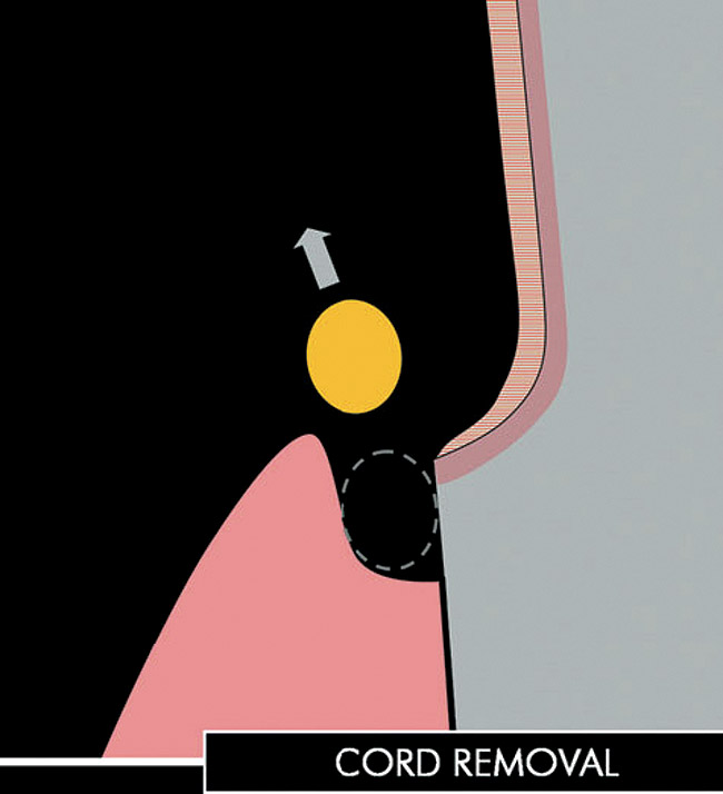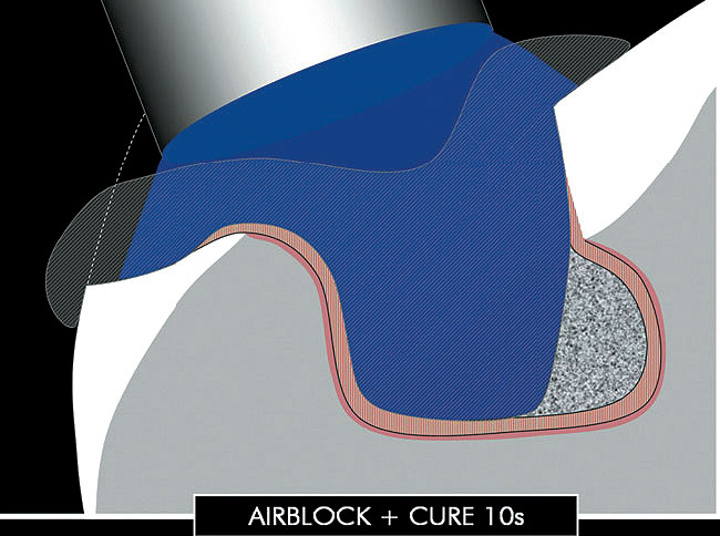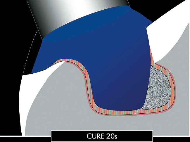 After a first curing (regular mode 20 seconds [Figure 2O and 2P), a layer of glycerin jelly (air block) is applied to the adhesive and slightly beyond. Additional curing (regular mode 10 seconds) of the DBA through a layer of glycerin jelly is recommended (Figure 2Q) to polymerize the oxygen inhibition layer and prevent interaction of the dentin adhesive with the impression material (especially polyethers). Accurate placement of the adhesive resin is usually confirmed by the removal of the deflection cord as the latter should not adhere to the margin (Figures 2R and 2S).