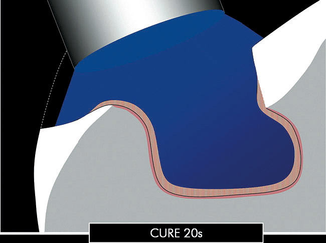 - Precuring of the DBA leads to improved bond strength. In most studies on DBA bond strength, the infiltrating resin and adhesive layer are usually polymerized first (precuring), before composite increments are placed, which appears to generate improved bond strength when compared with samples in which DBA and the overlaying composite are cured together.13,14 These results can be explained by the collapse of the uncured dentin-resin hybrid layer caused by pressure during composite placement or seating of the restoration.15-17 The hybrid layer may be weakened superficially as a consequence of the lower resin content of the compacted collagen fibers. This hypothesis is supported by the fact that structural defects and an intrinsic weakness of the hybrid layer have been shown to be associated with handling conditions of the DBA.18 Precuring the DBA is fully compatible with the direct application of composite restorations; however, it raises several issues when applied during the luting of indirect bonded restorations. Cured DBA thicknesses can vary significantly according to surface geometry, on average 60 µm to 80 µm on a smooth convex surface and up to 200 µm to 300 µm on concave structures such as marginal chamfers. 16,19 As a result, applying and curing the DBA immediately before the insertion of an indirect composite or porcelain restoration could interfere with the complete seating of the restoration. Practically speaking, it is therefore recommended that the adhesive resin be kept uncured before the restoration is fully seated. This, in turn, generates at least two significant problems: (1) while the restoration is being inserted, the outwardly directed flow of dentinal fluid dilutes the bonding agent and blocks microporosities into which the resin otherwise would have penetrated20,21; and (2) the pressure of the luting composite during the seating of the veneer can create a collapse of demineralized dentin (collagen fibers) and subsequently affect the adhesive interface cohesiveness.15-17 It has been proposed that the adhesive layer be thinned to less than 40 µm to allow for precuring (before the insertion of the restoration); however, because methacrylate resins show an inhibition layer up to 40 µm when they are light cured,22 excessive thinning can prevent the curing of light-activated DBAs. All the aforementioned issues can be resolved if eventual dentin exposures are sealed immediately, with the DBA being applied and cured directly after the completion of tooth preparations, before the final impression itself, which has been confirmed to generate superior bond strength23,24 and fewer gap formations.16,25 The resulting interphase could potentially better withstand long-term exposure to thermal and functional loads compared with the same adhesive being applied and cured together with the restoration.
