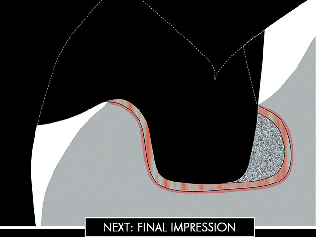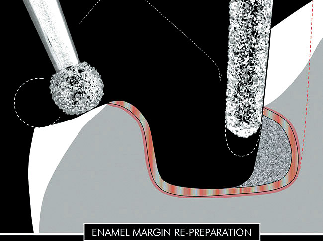 IDS can be immediately followed by the placement of a base of composite (Figures 3G and 3H) to block eventual undercuts and/or to build up excessively deep cavities to maintain reasonable restoration thickness, facilitating the subsequent use of a light-cured composite as luting agent. After final polymerization of the inhibition layer (Figure 3I), enamel margins are usually reprepared just before final impression to remove excess adhesive resin and provide ideal taper (Figures 3J and 3K).